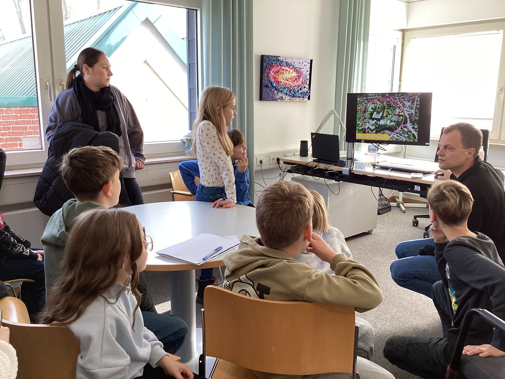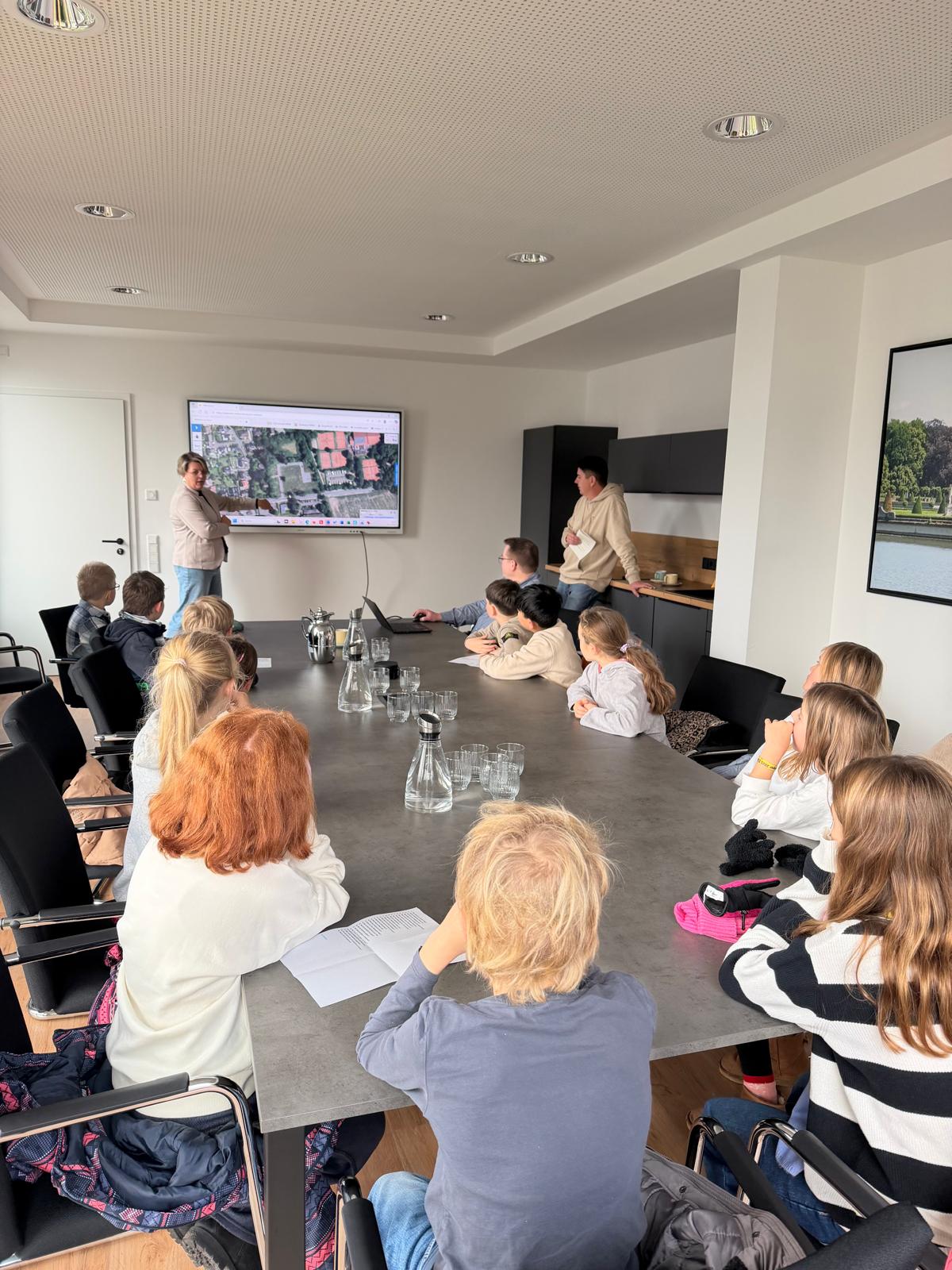 Die vierte Gruppe machte sich auf den Weg zur Gemeinde. Dort begrüßte Bürgermeisterin Frau Holz und Herr Schlecht aus der Stadtplanung die Kinder. Im Besprechungsraum erfuhren sie, wie sich ihr Wohnort entwickelt hat, wie er heute gestaltet wird und welche Ideen es für die Zukunft gibt. Außerdem lernten sie, welche Aufgaben zur Arbeit eines Stadtplaners gehören.