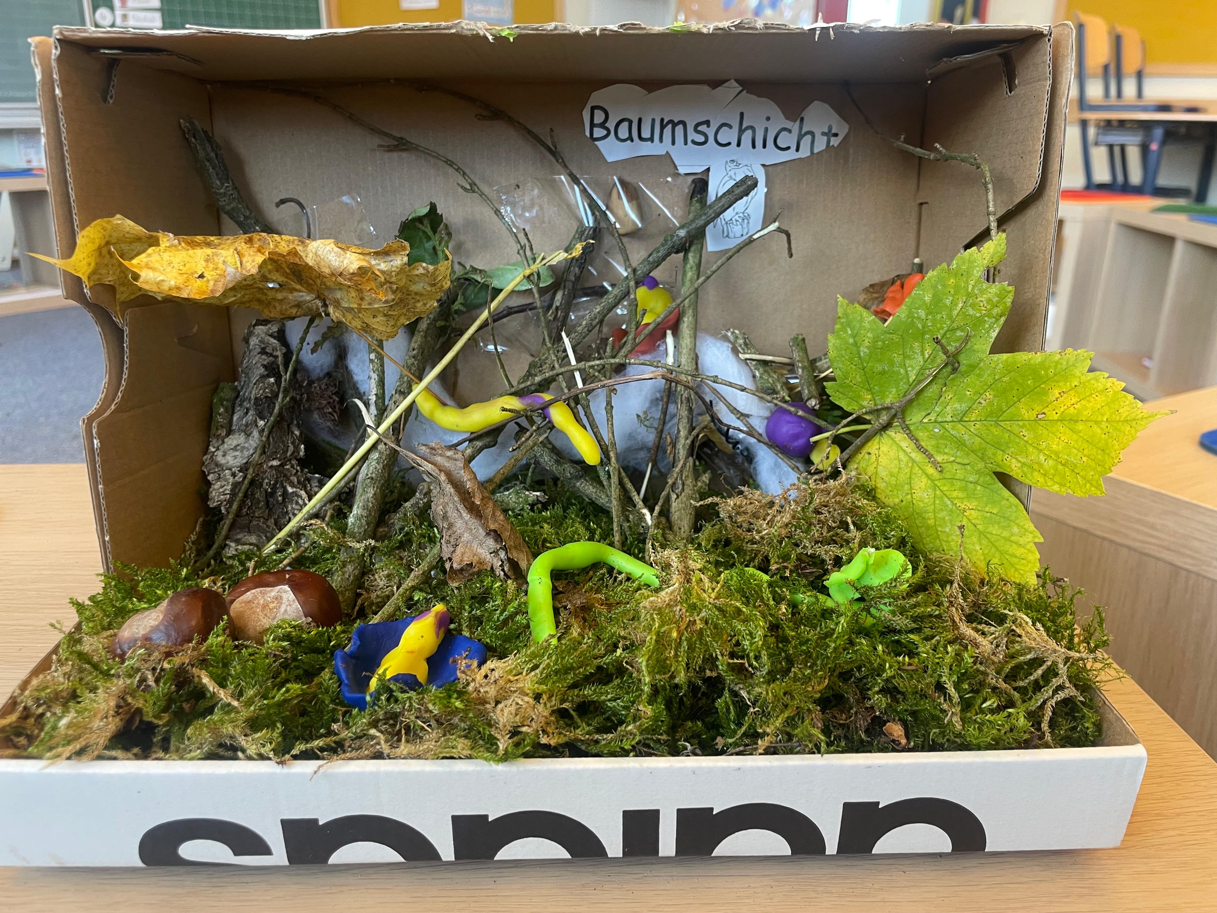 Im Sachunterricht hat sich der dritte Jahrgang in den letzten Stunden intensiv mit dem Thema Wald beschäftigt. In Gruppenarbeit entstanden kreative Schuhkarton-Modelle, in denen die Kinder verschiedene Waldschichten dargestellt haben. Mit viel Freude sammelten die Kinder zu Hause und auf dem Schulhof alles, was in den einzelnen Schichten wächst und lebt: kleine Basteleien, Tiere und Figuren, Blätter, Zapfen und Pflanzen - und verwandelten ihre Kartons so in kleine, detailreiche Mini-Wälder.