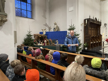 In der ersten Schulwoche nach den Weihnachtsferien fand wieder unser traditioneller Besuch an der Krippe in der Mauritiuskirche statt. Von Mittwoch bis Freitag besuchten alle Klassen die Krippe. Gemeinsam mit Herrn Porsche wurde gesungen, gebetet und eine Geschichte zum Thema Freude und Frieden gehört. Der Segen der Sternsinger wurde dann mit in die Schule genommen. Wie jedes Jahr wurde er über allen Klassentüren sowie an den Haupteingängen angebracht. Der Segen soll im Jahr 2026 alle, die die Schule betreten, beschützen und immer wieder an Frieden und ein gutes Miteinander erinnern.