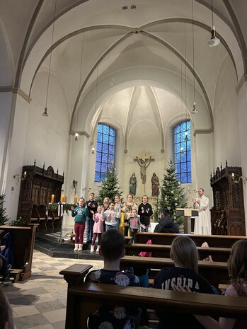 Am letzten Schultag vor den Ferien sind alle Klassen in die Mauritiuskirche gegangen. Herr Porsche leitete den Gottesdienst und viele Kinder beteiligten sich aktiv am Gottesdienst, indem sie Fürbitten vortrugen. Im Mittelpunkt des Gottesdienst stand das Thema "Das Licht der Welt". Gemeinsam hörten wir, dass jedes Kind ein Licht sein kann - durch Freundlichkeit, Hilfsbereitschaft und ein gutes Miteinander. Auch der Chor trug verschiedene Lieder vor und sorgte so für eine feierliche Stimmung. Wir wünschen nun allen Familien ein tolles Weihnachtsfest, einen guten Rutsch und erholsame Ferien!